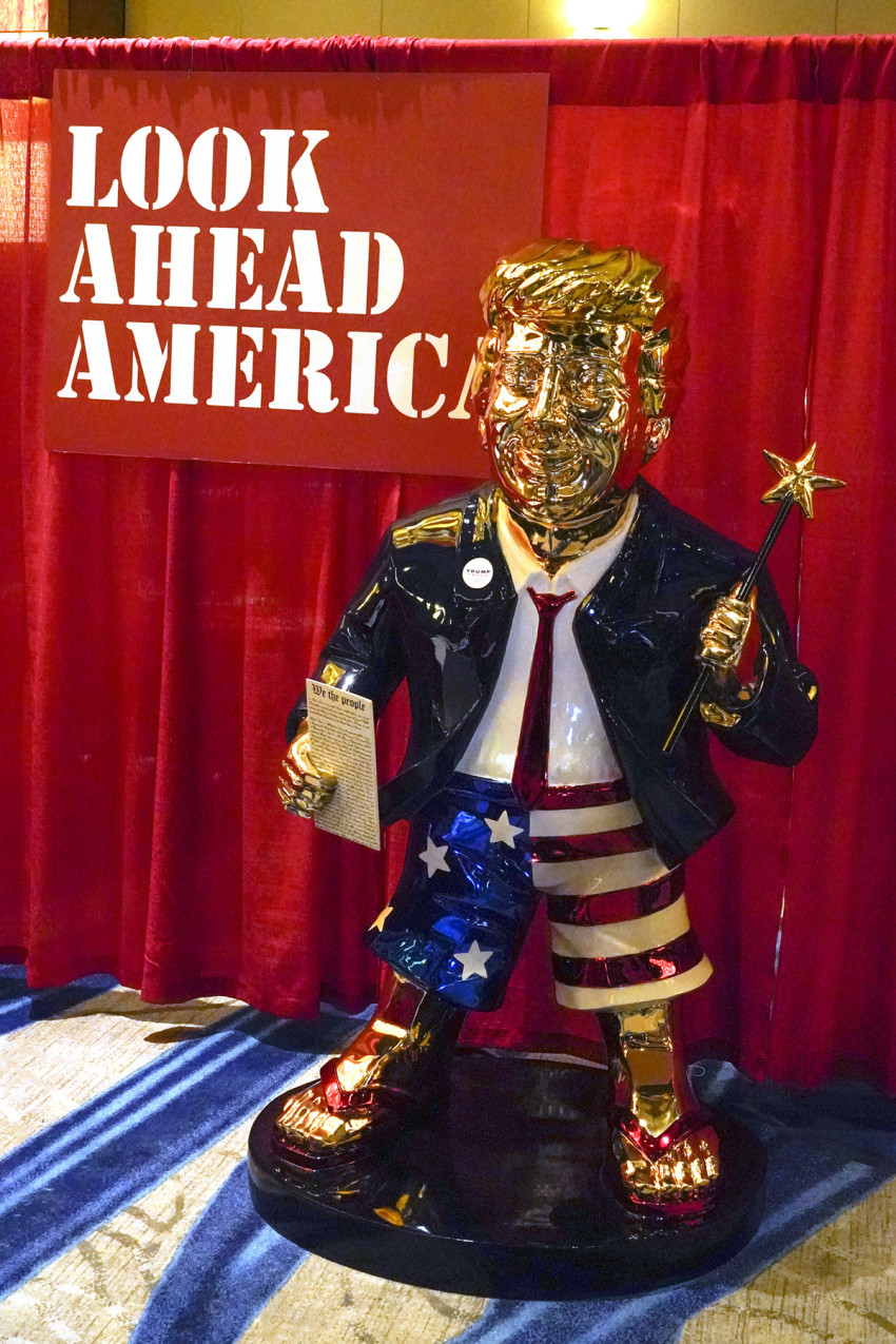 | Golden statue of Trump at CPAC in Orlando (2021), made by Shijiazhuang D & Z Sculpture Co., China |